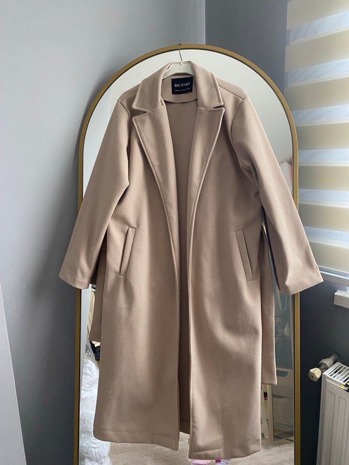 Bej renkli, uzun kesim süet kumaştan yapılmış bu kadın palto, klasik ofis şıklığı için keskin yaka ve uzun kollara sahiptir. Rahat ve şık bir görünüm sunar.