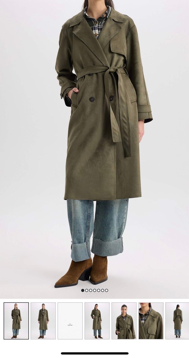 Bej ve gri tonlarda, süet kumaştan uzun, düğmeli, yakalı kadın trençkot. Uzun kollu, rahat kesim, günlük ve sokak stili için uygun.