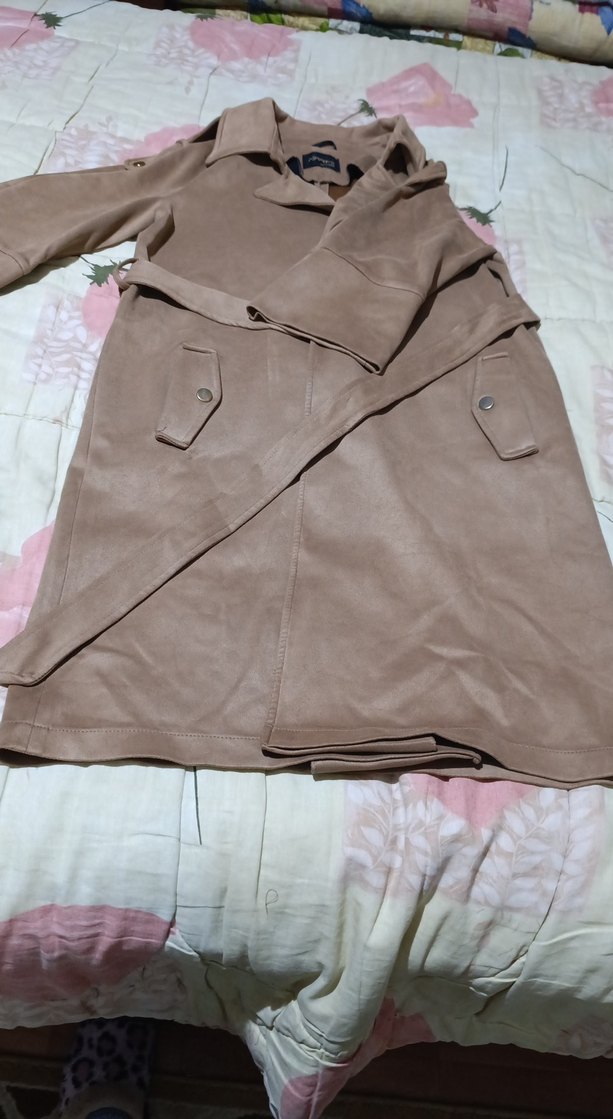 Bej süet malzemeden, kemerli ve uzun kollu, bol kesimli, notched lapel yaka detaylı kadın trençkot.