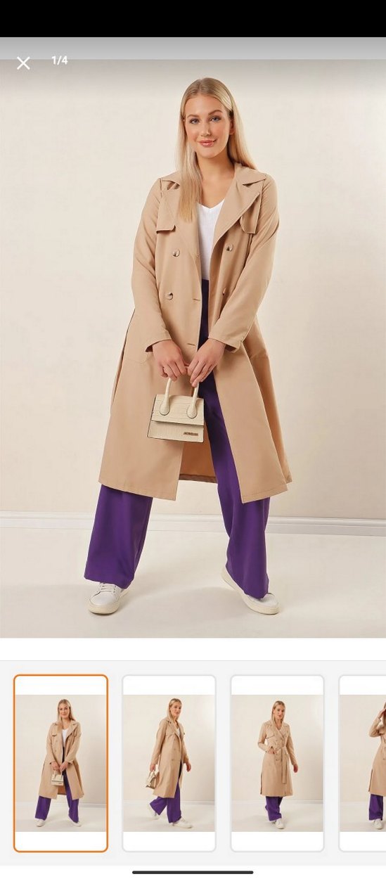 Bej süet kumaştan, kemerli ve uzun kesime sahip trençkot. Notlu yakası ve uzun kollarıyla günlük sokak stiline uygun, rahat kesimdir.