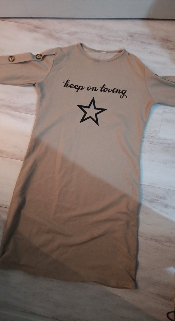 Bej renkli süet kumaştan, uzun kollu ve düğmeli hamile elbisesi. Önünde "keep on loving" yazılı baskı ve yıldız motifi bulunur. Rahat kesimli, günlük kullanıma uygun. ⭐