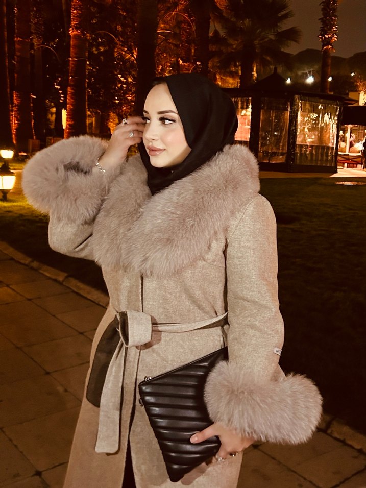 Bej süet kumaştan uzun kaban, kürk detaylı yakası ve manşetleriyle, kemerli ve regular fit kesimlidir. Günlük kullanıma uygundur. tek beden 38/42 uyumlu 65 kiloya kadar olur