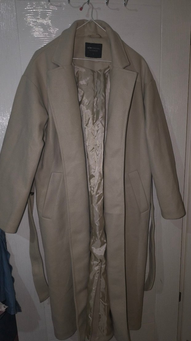 Bej süet kumaştan yapılmış, kuşaklı ve uzun kesim hamile kabanı. Notlu yaka ve uzun kollu, ofis için uygun minimalist tarzda.