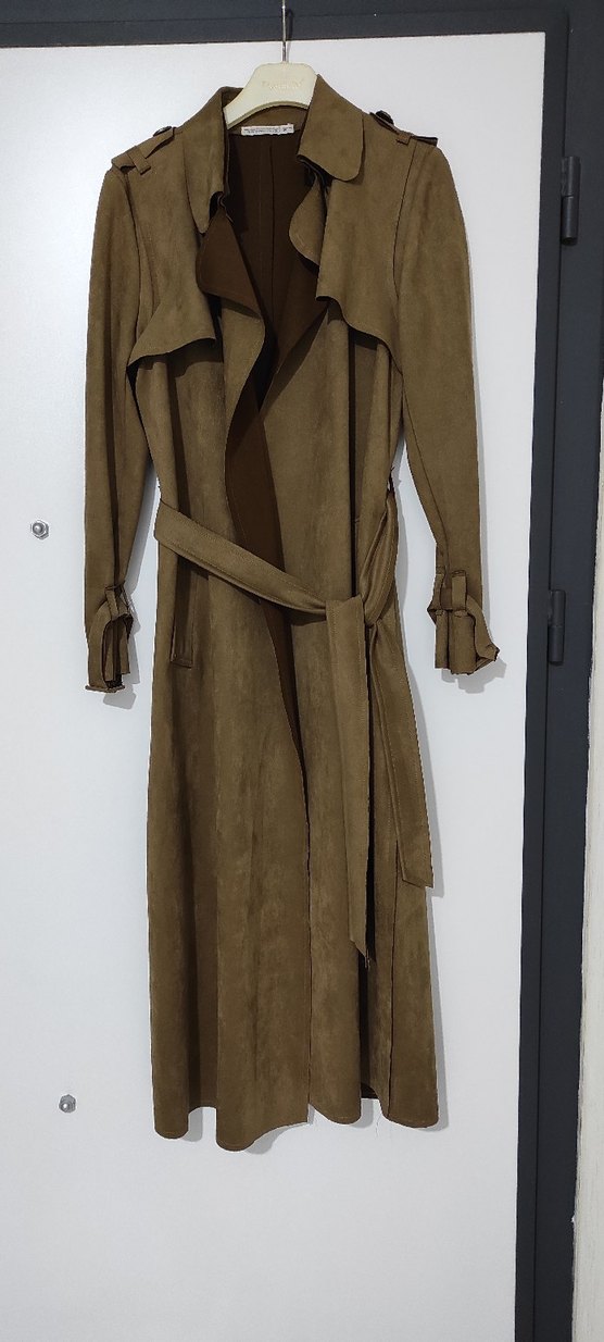kahverengi süet malzemeden yapılmış, uzun, kuşaklı, yakalı ve düz dokulu kadın trençkot. Günlük kullanıma uygun, rahat kesim ve çağdaş tarz sunar. Bir kere tek giyilmistir sıfır