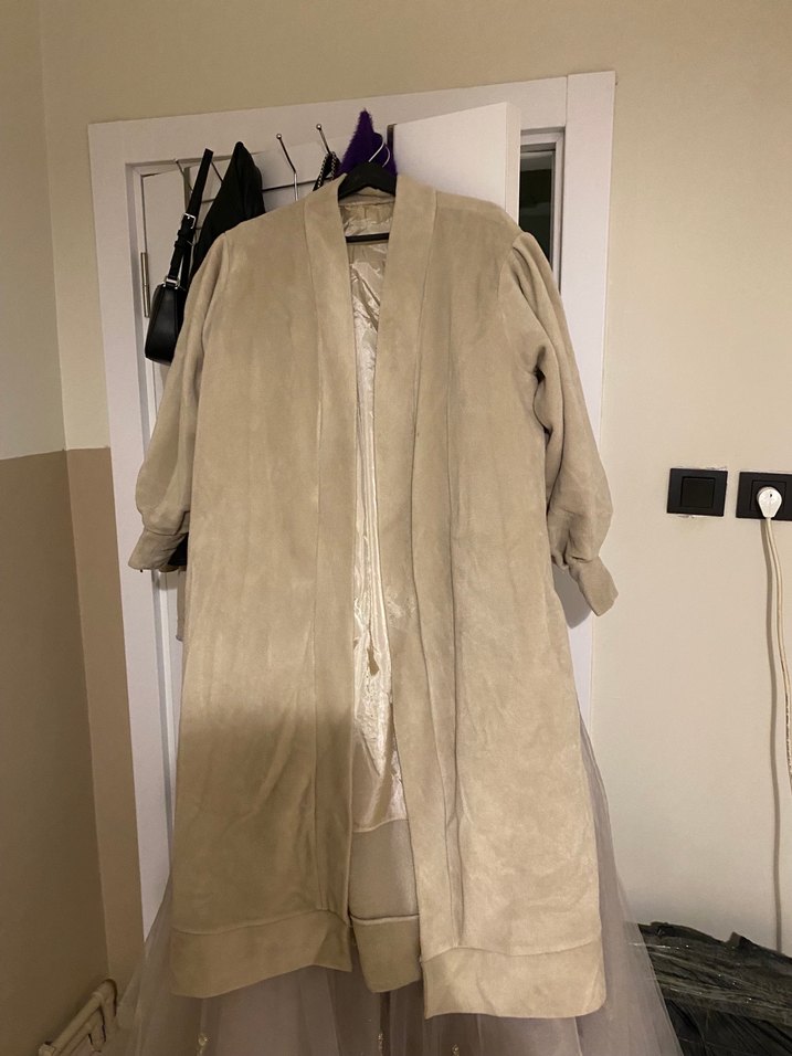 Bej renkli, uzun süet kumaştan yapılmış, salaş kesim ve drapeli kadın kaban. Uzun kollu ve kesik yakalı, bohem tarzını yansıtır.