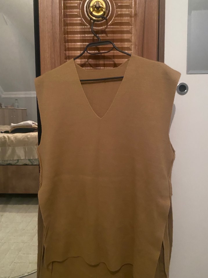 Bej süet kumaştan, V yaka ve kolsuz tasarıma sahip kadın süveter. Normal uzunlukta, midi kesim ve bol kalıpla minimalist, normcore tarzı sunar. Günlük kullanıma uygun, zahmetsiz şıklık sağlar.