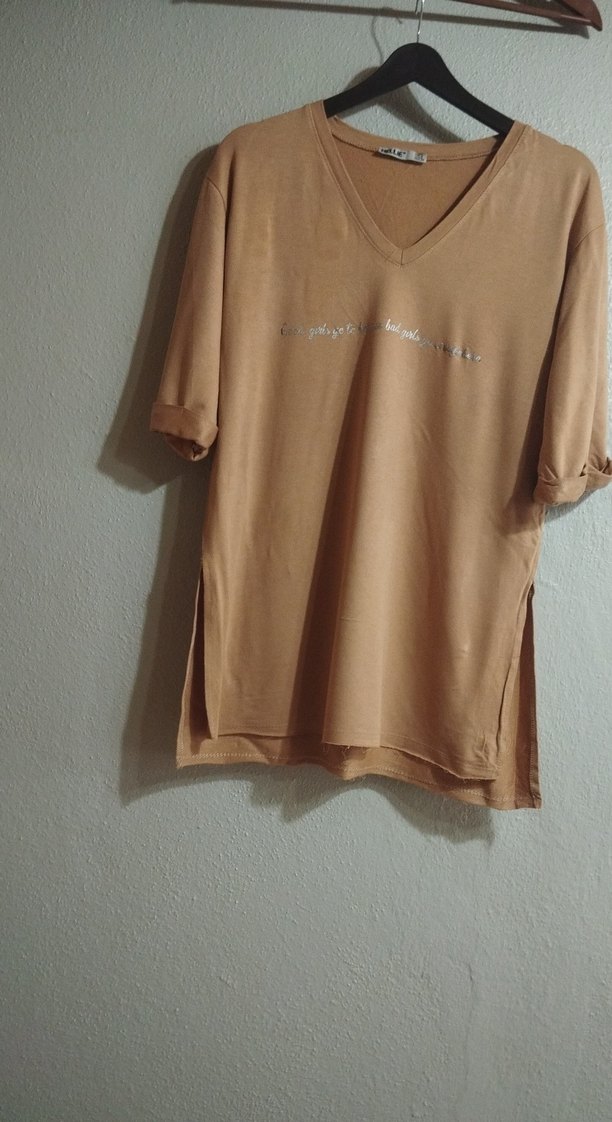 Bej renkli süet kısa kollu kadın tişörtü, V yaka ve bol kesim. Pastel tonlarda, desen içermeyen sade tasarım, günlük rahat kullanıma uygun.