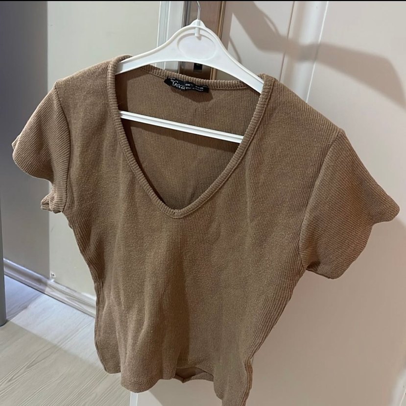 Bej süet kumaştan, V yaka ve kısa kollu, rahat kesim kadın tişörtü. Günlük kullanım için şık ve rahat bir seçim.