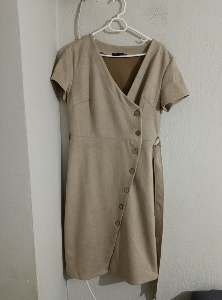 Bej süet kumaştan yapılmış, V yaka, kısa kollu ve düğmeli midi elbisedir. Rahat kesimiyle günlük ve ofis kullanımı için uygundur. ✨