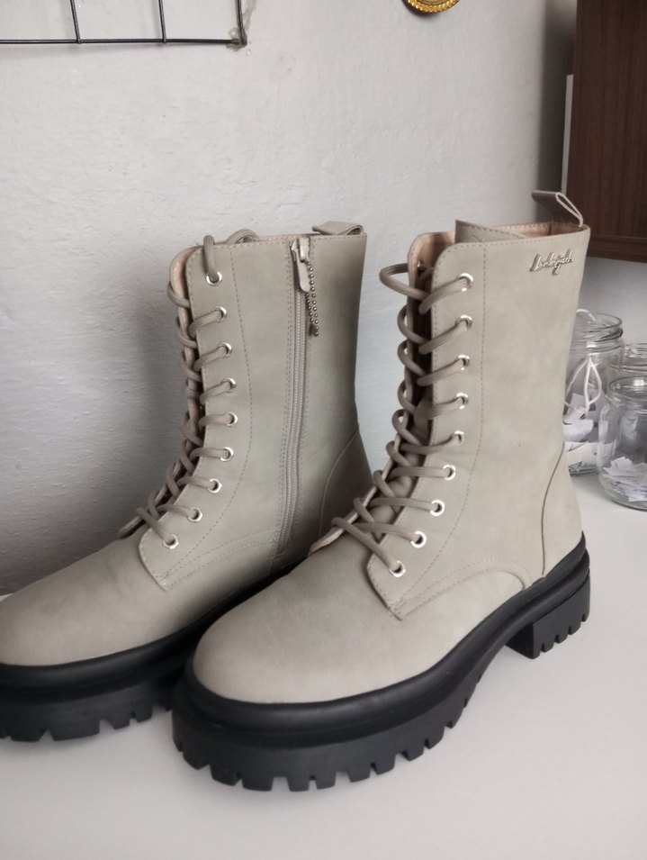 Bej süet malzemeden, yüksek topuklu ve bağcıklı tasarıma sahip kadın bot. Yan fermuarı kolay kullanım sağlar. Sokak stiline uygun günlük bot.