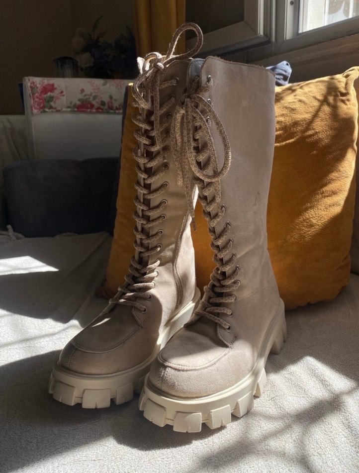 Bej süet malzemeden, yüksek topuklu ve bağcıklı ön kısıma sahip kadın çizmesi. Kemer detaylı, desensiz ve bohem tarzına uygun bir model.