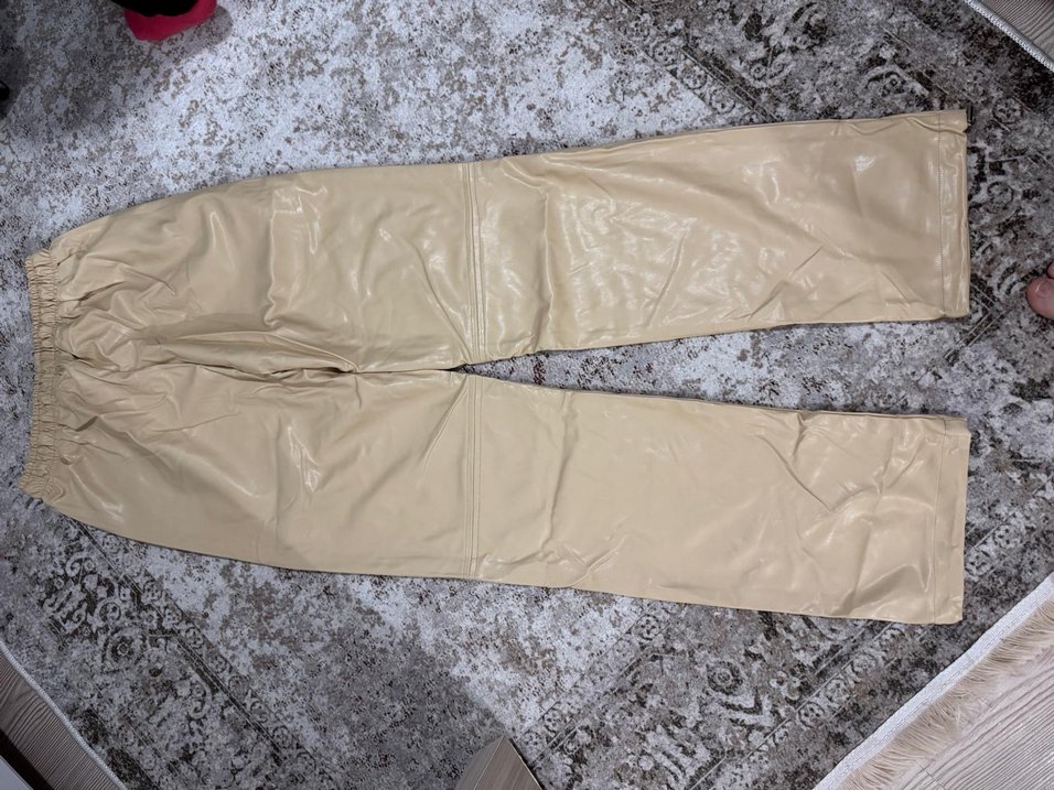 Bej renkli, deri kumaştan üretilmiş kadın pantolon. Rahat kesim, uzun boy ve parlak yüzeye sahip, fermuarlı detaylar içerir.