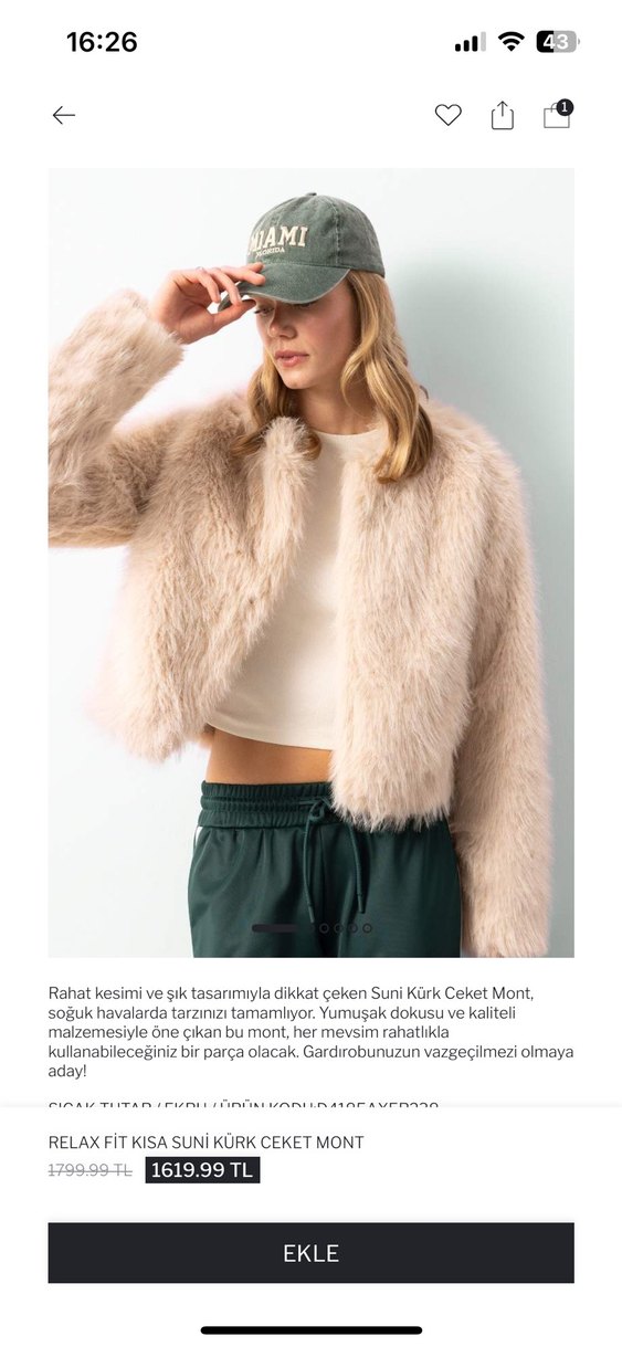 Yumuşak dokulu, suni kürk ve uzun kollu, rahat kesimli bej kısa mont. Sade tasarımıyla günlük ve şık kombinlere uygun, sokak modası stilinde bir parça.