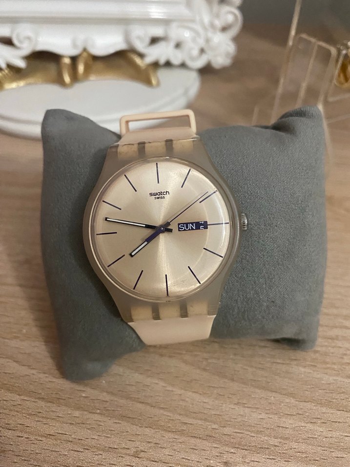 Bej renkli Swatch kadın saati, tokalı kayış ve gün göstergesi (SUN) ile minimalist tasarıma sahip modern klasik bir modeldir. ⌚