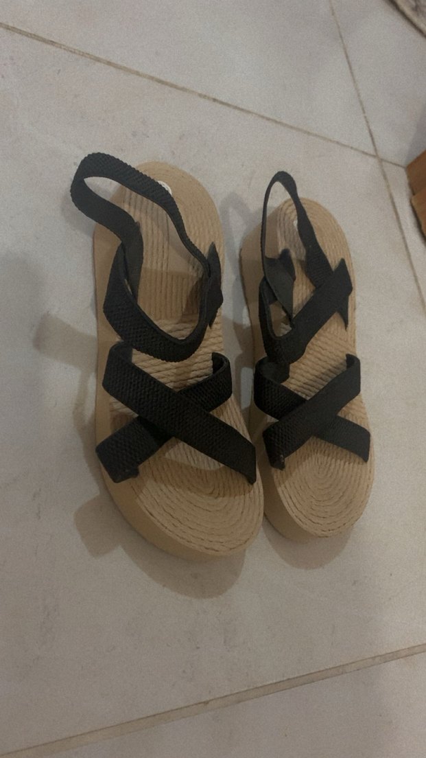Bej tabanlı, siyah lastikli bantlara sahip kadın dolgu topuklu sandaletler, günlük kullanıma uygun minimalist ve bohem tarz sunar.