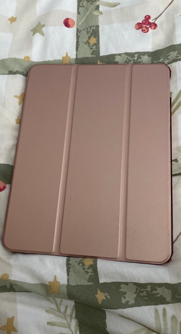 Ekranı koruyan ve cihazı destekleyen üç katlı kapaklı bej tablet kılıfı.
