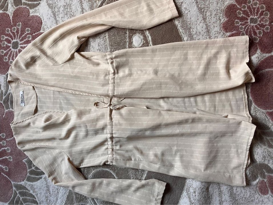 Yumuşak keten kumaştan, düğmeli ve V yaka, ayarlanabilir belden bağlamalı