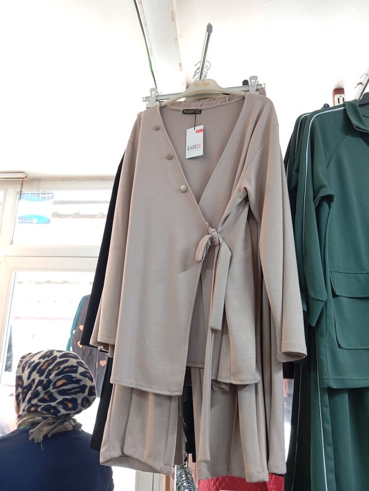 Bej renkli, kısa boylu ve bol kesimli kruvazör yakalı takım. Uzun kollu, düğmeli ve kesik yaka detaylı, yumuşak oysho kumaştan üretilmiştir. farklı model ve rengi vardır sorabilirsiniz