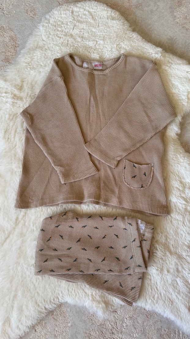 Bej renkte, uzun kollu takımı. Üstte küçük cep detayı ve alt kısmında hafif desenli pantolon bulunur. Yumuşak ve rahat gofreli kumaş.