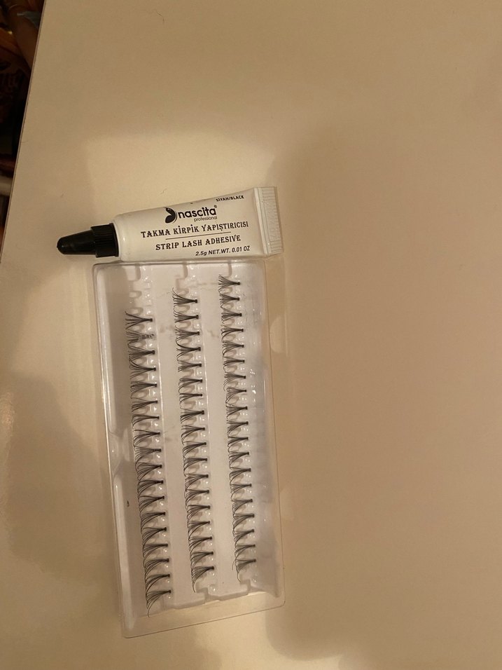 Bej tonlarında takma kirpikler ve uygulama için kirpik yapıştırıcısı içeren set. Kirpikler doğal gri tonlara sahiptir. ️