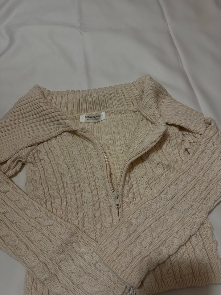 Bej renkte, yüksek yakalı, uzun kollu ve Tam fermuarlı örgü kadın kazak. Sade desensiz ve rahat bir dokusu vardır.