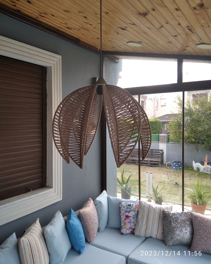 Örgü malzemeden yapılmış, yaprak şeklinde tasarlanmış bej sarkıt lamba, doğal bir dokunuş katar.
