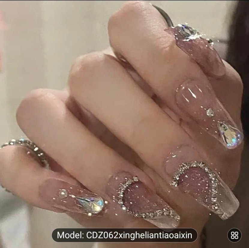 Işıltılı taşlar ve kristal detaylarla süslenmiş açık bej 24 parça takma tırnak seti