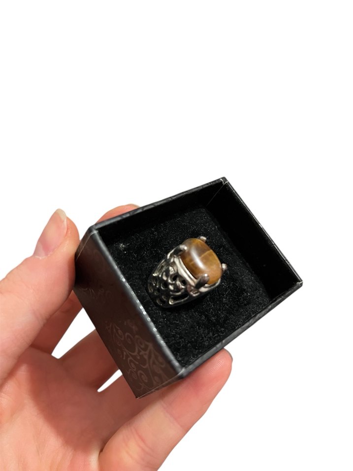 Bej taşlı, karmaşık metal bantlı gotik tarzda erkek yüzüğü, rock punk havası yaratır.