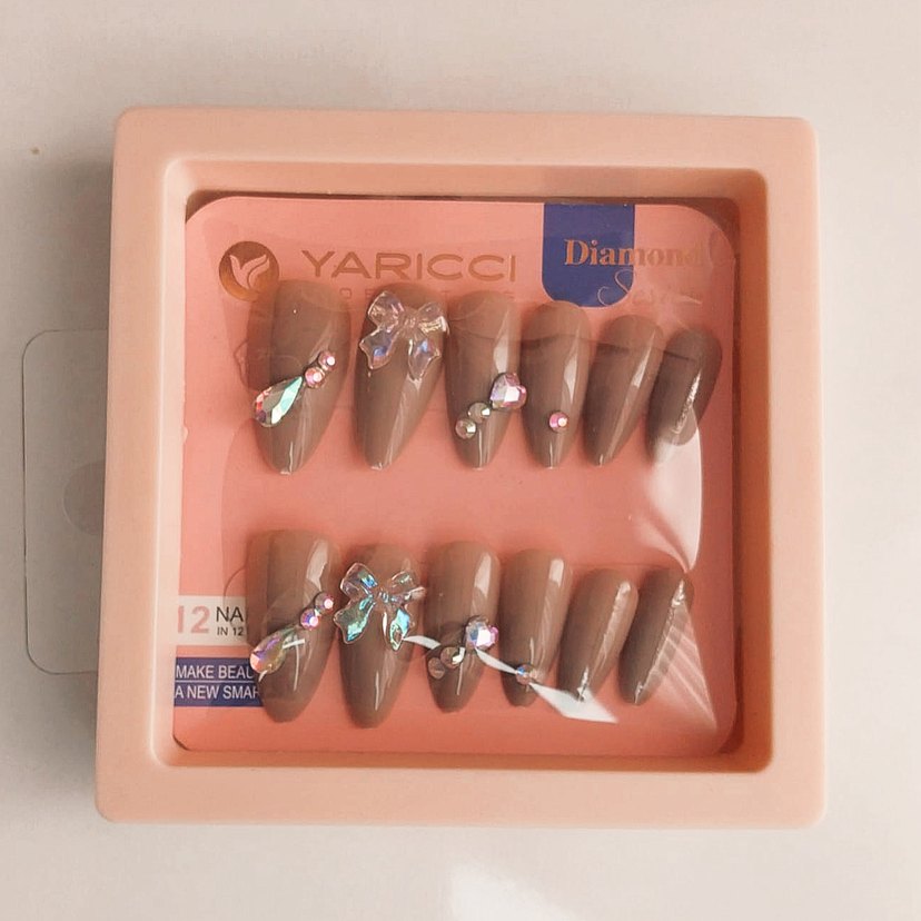 Parlak kristal taşlarla süslenmiş koyu bej tırnak süsleri. Farklı tasarımlardan oluşan 12 parçalık set.