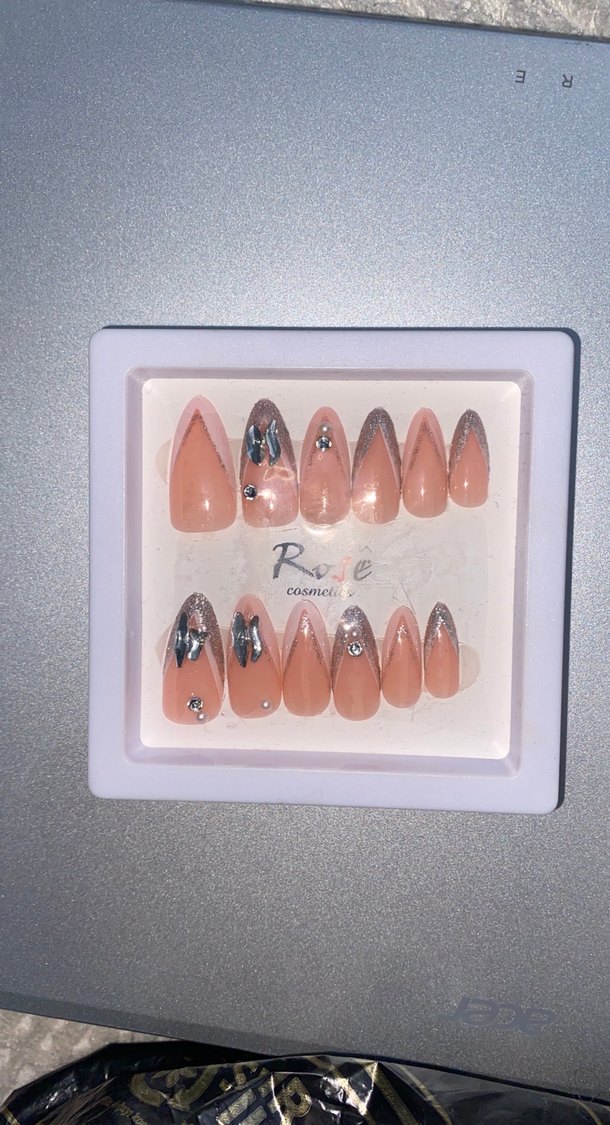 Gümüş uçlu ve taş detaylı açık bej takma tırnak seti.