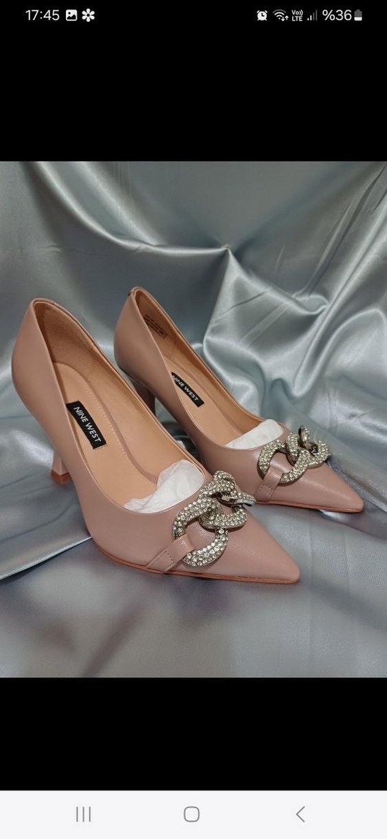 Bej renkte, tokalı ve taşlı detaylı modern klasik stilettolar, ofis için uygun yüksek topuklu ayakkabılar.
