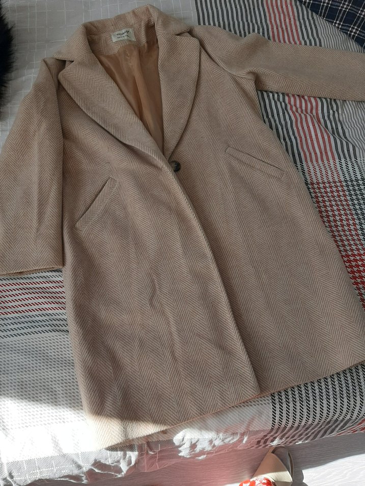 Bej renkte, tek düğmeli, hafif dokulu balıksırtı desenli kaban. İki yan cep ve klasik yakaya sahip.
