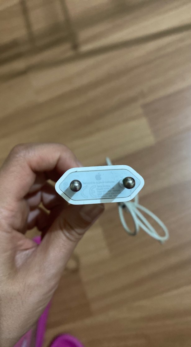Bej renkli, iki pinli priz tasarımına sahip telefon şarj adaptörü. Standart prizlerle uyumludur.