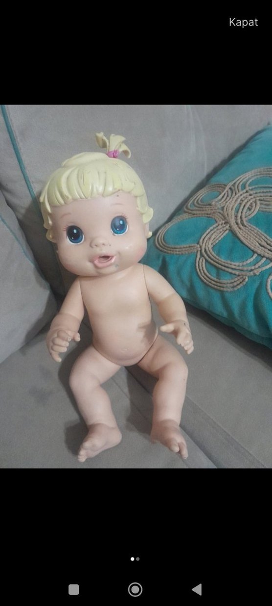 Mavi gözlü, sarı saçları toplu bej ten renkli pastel bebek. Yumuşak ve pürüzsüz dokuya sahip, detaylı yüz ifadeleri içerir.