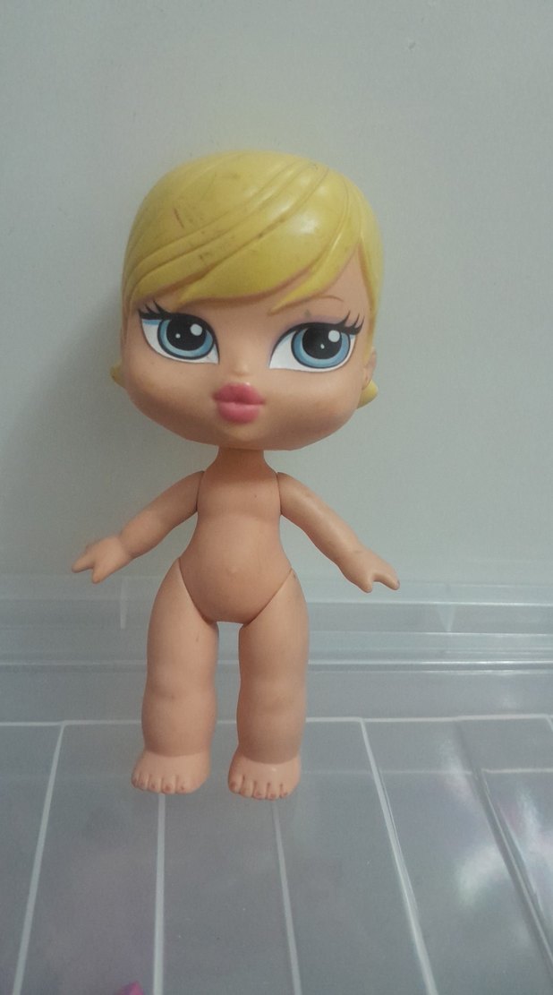 Pastel tonlarda bej tenli, büyük gözlü ve sarı saçlı çıplak bebek oyuncak. Yumuşak ve pürüzsüz yüzeyli.