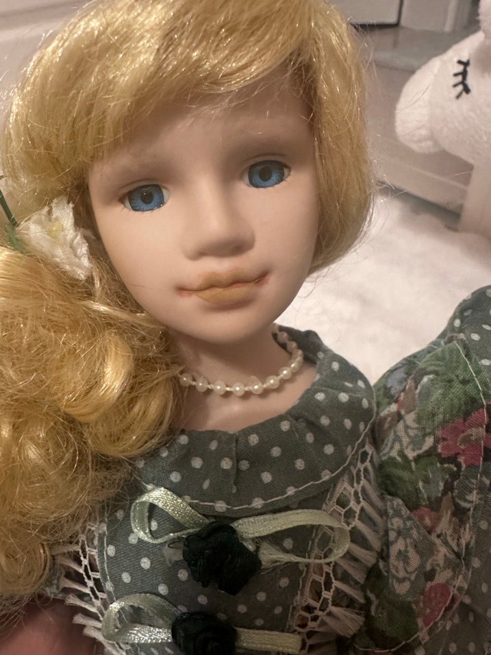 Mavi gözlü, sarı saçlı, bej tenli pastel renklerde bebek. Puantiyeli dantel detaylı kıyafet ve inci kolye ile süslenmiş.son resimdeki pembe elbisesi ile gönderilecek bilginize