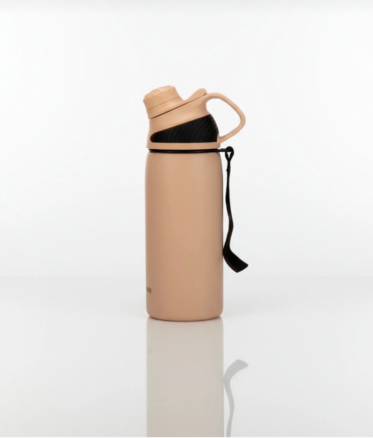 Bej renkli çocuk termos matara, güvenli kapak ve taşıma askısı ile içecekleri sıcak veya soğuk tutar. Pastel tonu yumuşak bir görünüm sunar.