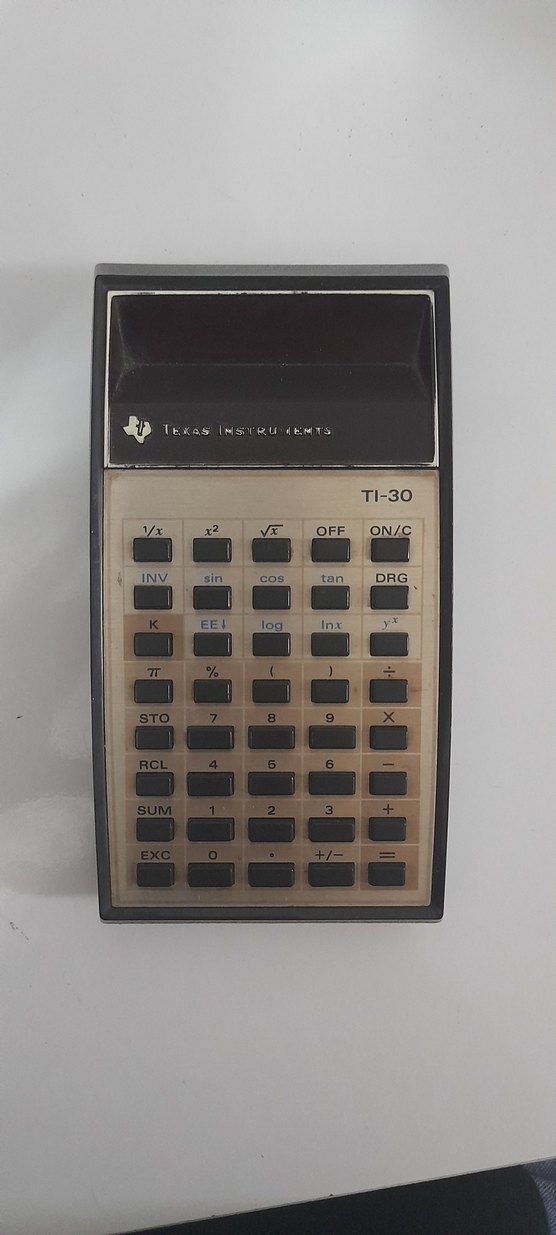 Bej TI-30 hesap makinesi, koyu üst panel ve bilimsel fonksiyon tuşları ile Texas Instruments'dan. Matematik ve fen işleri için uygundur. antika hesap makinasi