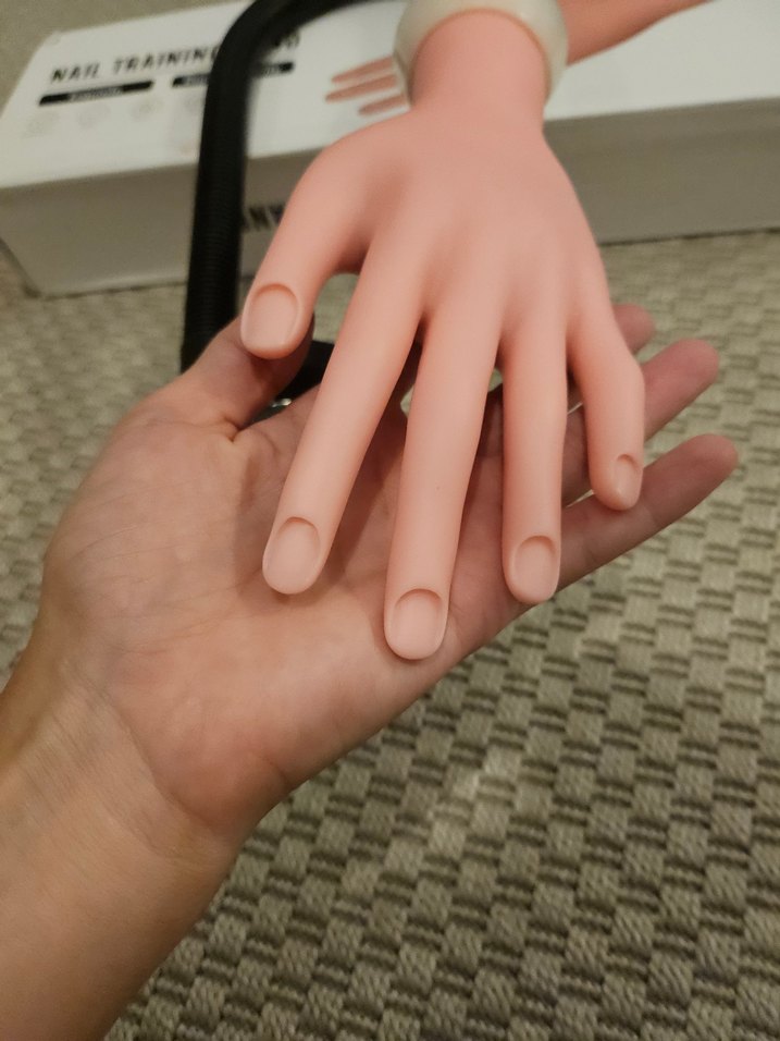 Bej renkte tırnak eğitimi için kullanılan el modeli, tırnak bakımı ve uygulama pratiği yapmaya uygundur. ️
