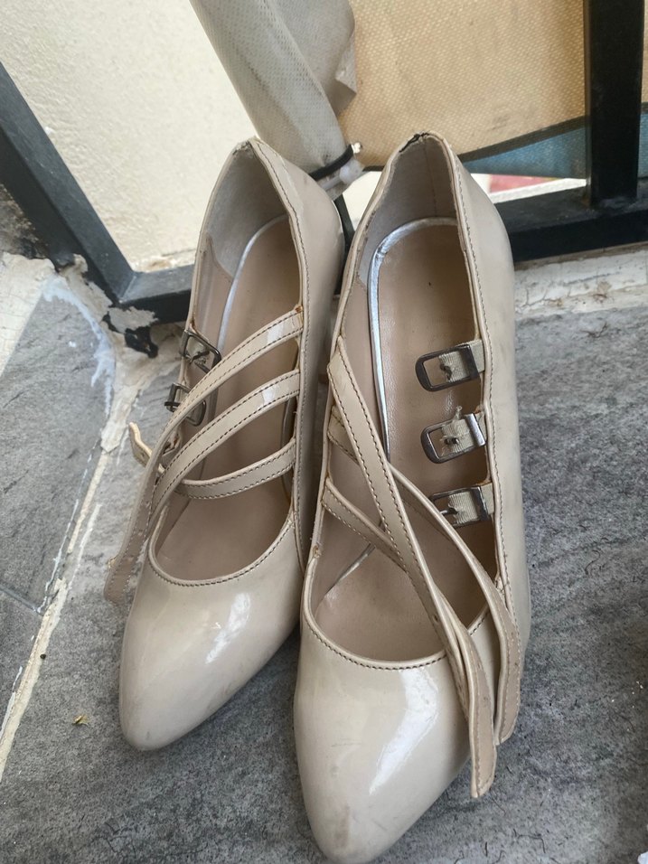 Bej renkte, toka detaylı ince topuklu kadın ayakkabısı. Kauçuk malzemeden üretilmiş, desen içermeyen sokak stiline uygun tasarım.