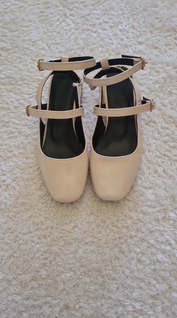 Bej renkte, tokalı kayışlara sahip ince topuklu babet. Kauçuk malzemeden yapılmış, desensiz, günlük kullanıma uygun klasik zarafet ve normcore tarzını yansıtır.