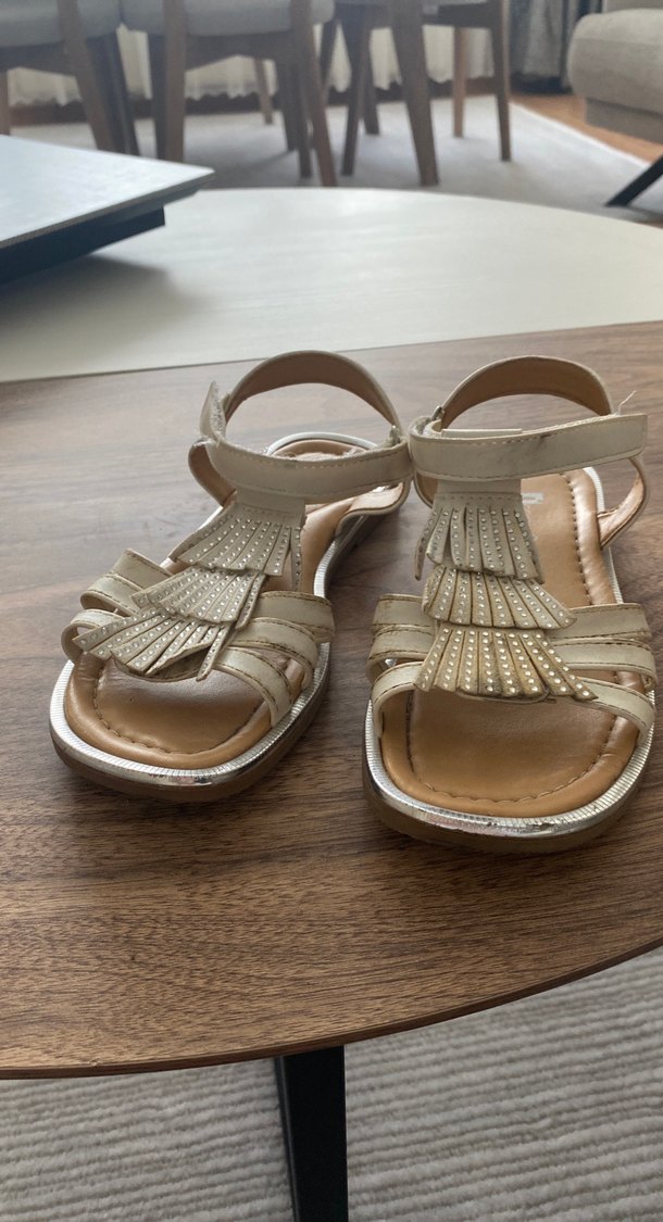 Bej renkte tokalı, bohem tarzda kız sandaletleri. Püskül detayları ve kauçuk tabanıyla rahat ve retro görünümlü.