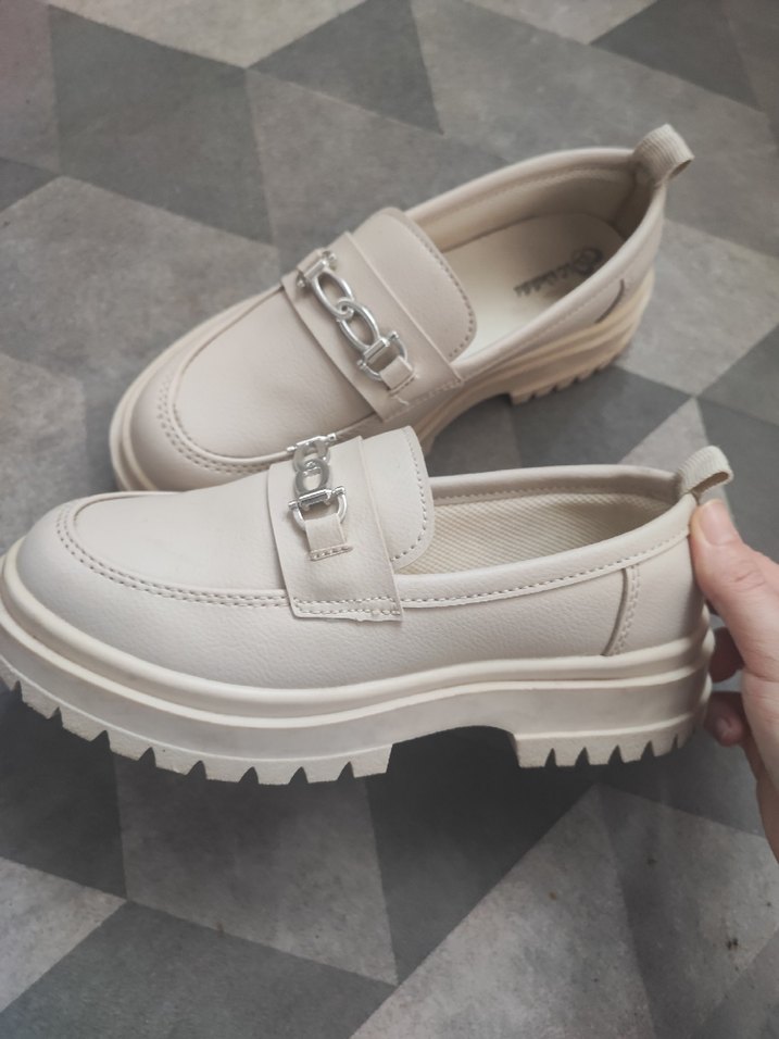 Bej renkli, tokalı ve platform tabanlı kadın loafer. Günlük sokak stili için uygun, lastik tabanlı ve pastel tonlarda.