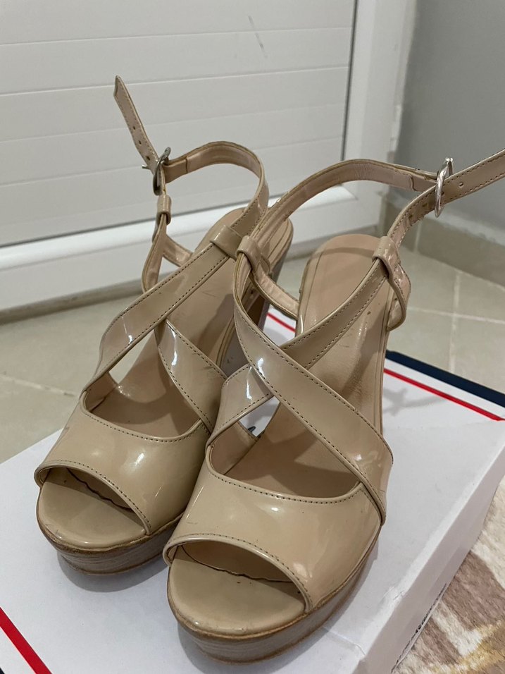 Bej renkte, tokalı bantlara sahip dolgu topuk kadın ayakkabısı fotoğrafta göründüğü gibidir fiyat ona göre belirlenecek marka temsili
