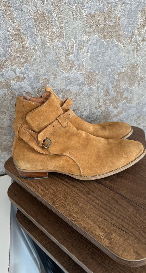Bej renkte, parlak görünümlü erkek botları tokalı kayış detayına sahip, klasik ve sokak stili uyumlu, desensiz tasarım.