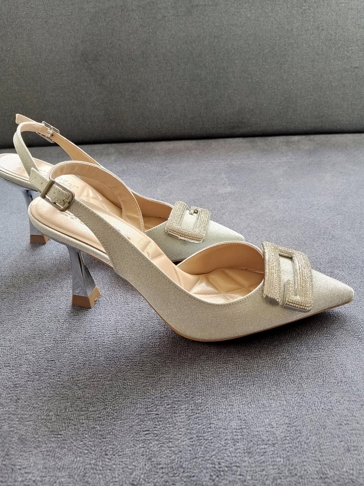 Bej renkte, tokalı ve ince topuklu kadın abiye ayakkabısı. Düğünler için uygun modern klasik tasarım, yumuşak kauçuk malzeme kullanılmış.