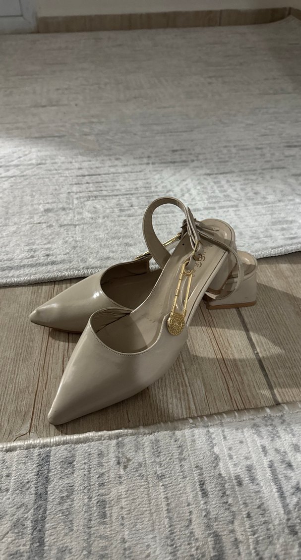 Bej renkli, tokalı, ince topuklu kadın ayakkabısı. Modern klasik tarzda, desen içermeyen ve günlük kullanıma uygun rahat bir model.