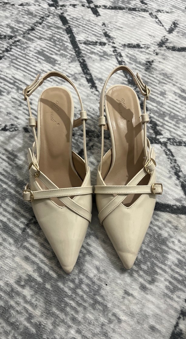 Bej renkte, tokalı ve ince topuklu kadın ayakkabısı. Pürüzsüz kauçuk malzemeden yapılmış, modern klasik tasarıma sahip günlük kullanıma uygun ayakkabı.