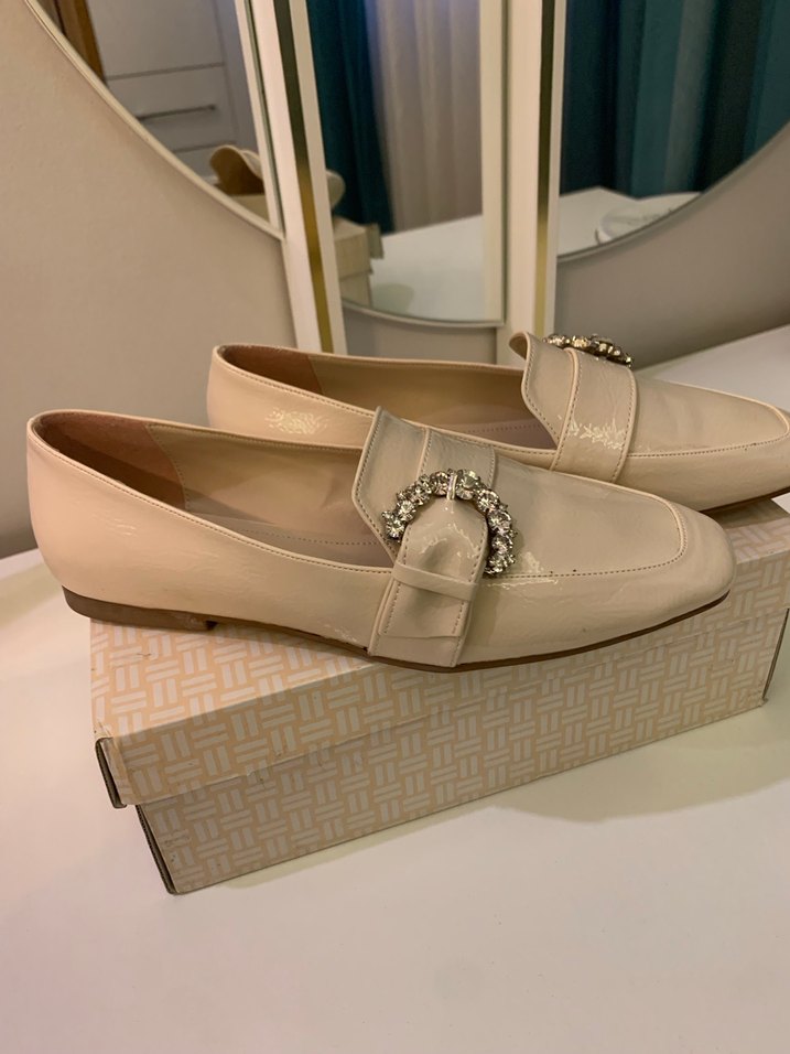 Bej renkte, tokalı kadın babetler, blok topuklu ve düz yüzeylidir. Kauçuk tabanıyla modern klasik stili ve günlük rahatlığı bir arada sunar. Hiç kullanılmamıştır.