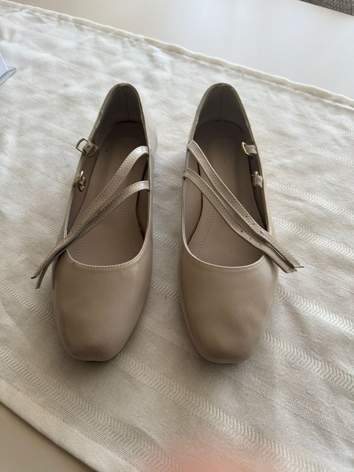 Bej renkli, tokalı bantlı, blok topuklu kadın babetleri. Kauçuk malzemeden yapılmış, pastel tonlarda ve desen içermeyen, günlük kullanıma uygun ayakkabılar.